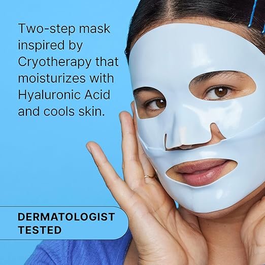 A two-step face mask inspired by Cryotherapy that moisturizes with Hyaluronic Acid and cools skin. It includes a highly concentrated ampoule with Hyaluronic Acid and a soft, flexible, skin-cooling mask.