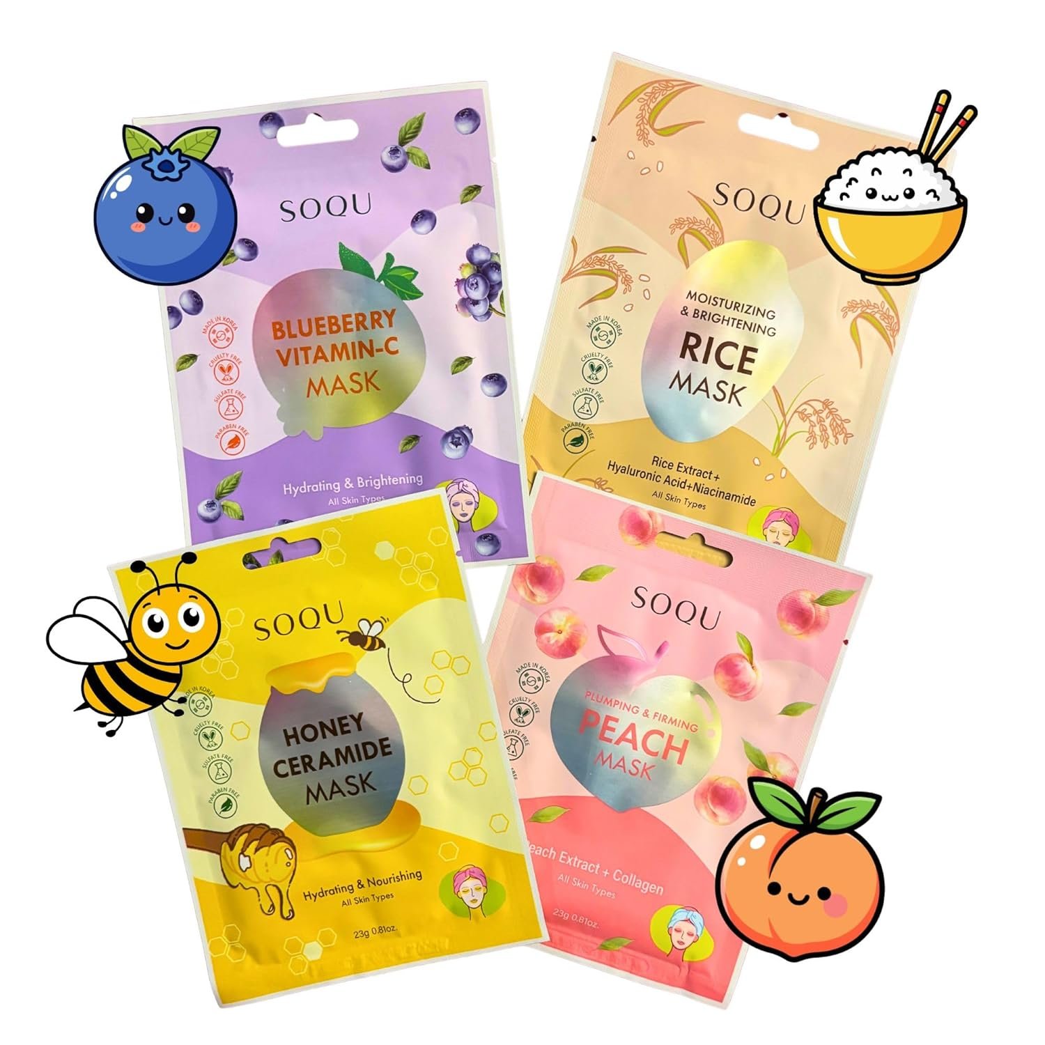 SOQU Additive Glow Masks- Variety pack of 12 Individual masks (Peach, Rice, Blueberry, Honey)SOQU Additive Glow Masks- Variety pack of 12 Individual masks (Peach, Rice, Blueberry, Honey)