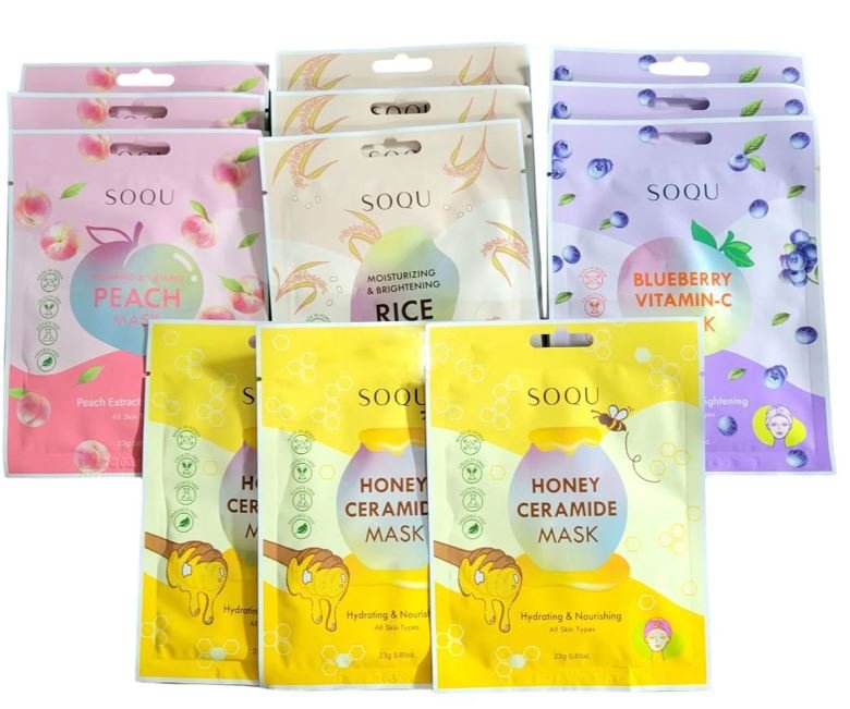 Grab your favorite SOQU Korean sheet masks in a 12 pack variety that includes 4 types (Peach, Rice, Blueberry, Honey) with 3 sheets each designed to plump, hydrate, brighten, and rejuvenate all skin types.  Each individual facial mask is enriched with botanical extracts and nutrients to target different skin concerns.  It easy-to-use for relaxation and rejuvenation anytime as part of your daily self-care regiment to healthy glowing skin.  All masks in this set are made with skin-friendly ingredients, free from harsh additives and PETA approved.  The set is suitable for all skin types with nourishing natural ingredients that help restore balance and promote a healthy glow.