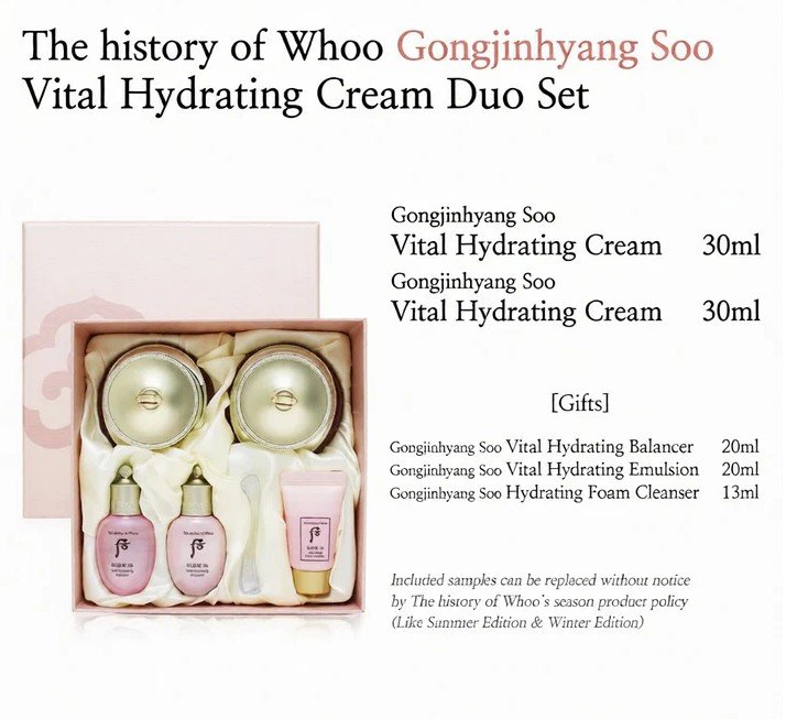 The Whoo Gongjinhyang: Soo Vital Hydrating Cream Duo Set is a collection designed to deliver deep, long-lasting hydration with a luxurious, concentrated texture that melts into the skin and locks in moisture for hours to promote a clear, dewy complexion.